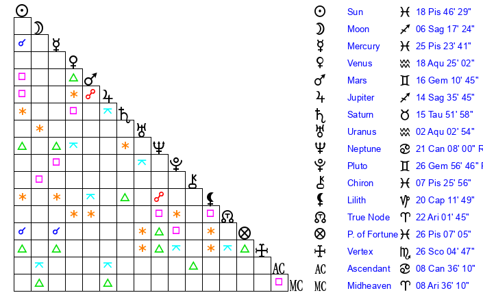| Sun | 18 Pisces 46 | 19 Pisces 22 | 8 Cancer 29 |