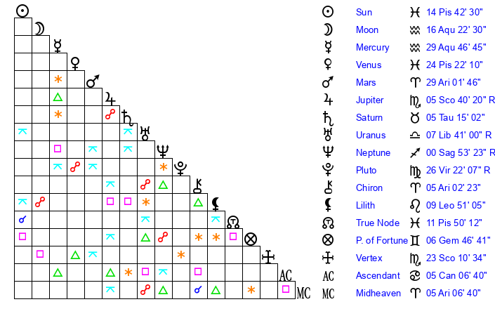 Moon | 16 Aquarius 32 | 2 Gemini 39 | 21 Aquarius 59 |