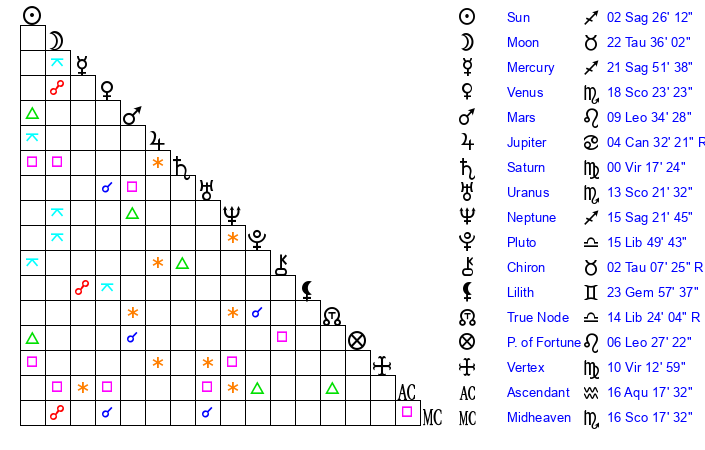 | Neptune | 15 Sagittarius 22 | 27 Pisces 10 | 17 Sagittarius 5 |