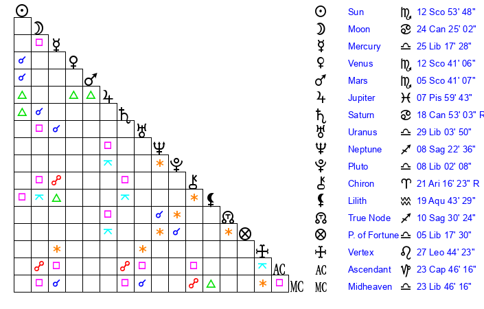 | Sun | 12 Scorpio 54 | 13 Scorpio 46 | 3 Capricorn 31 |