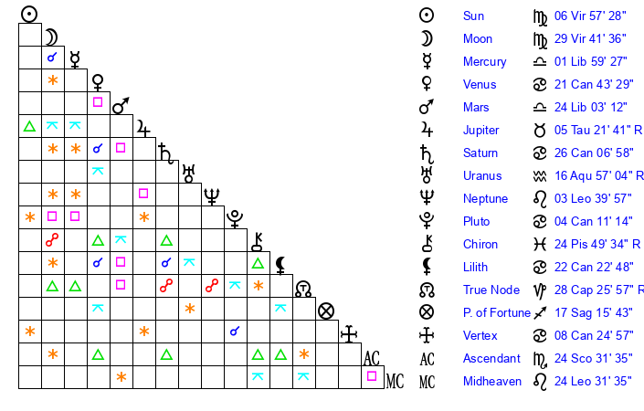 | Moon | 29 Virgo 49 | 1 Sagittarius 28 | 24 Virgo 49 |