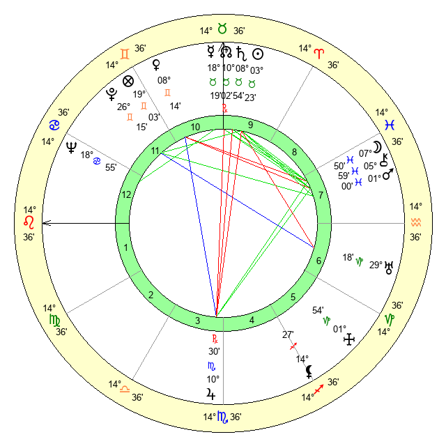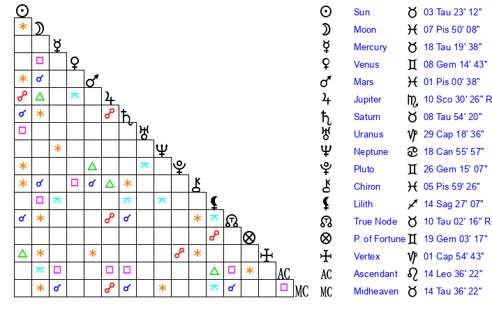 | Moon | 7 Pisces 41 | 21 Pisces 16 | 12 Taurus 17 |