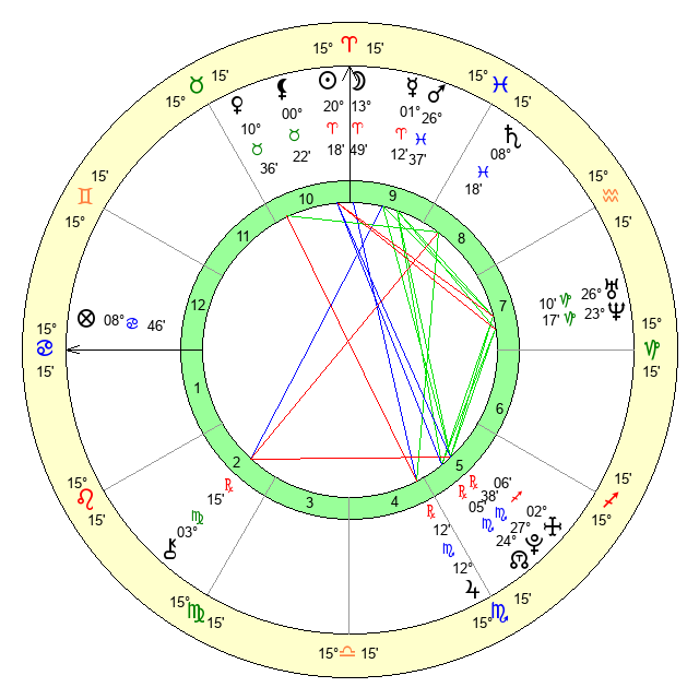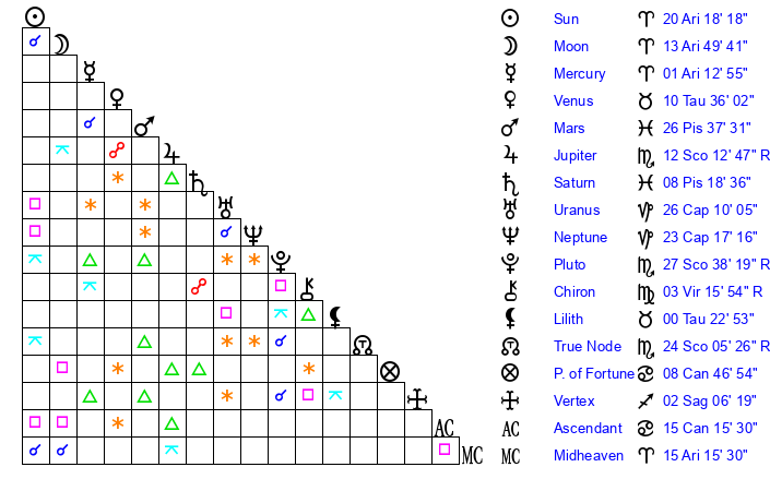 Moon | 13 Aries 43 | 22 Virgo 19 | 28 Taurus 10 |