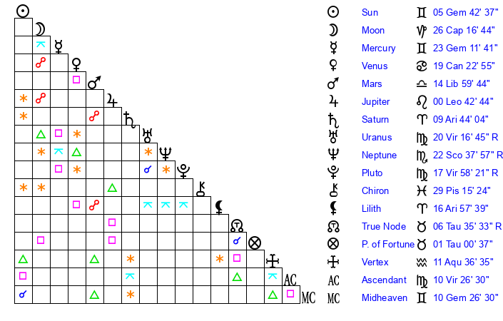 | Moon | 26 Capricorn 20 | 14 Gemini 53 | 8 Pisces 6 |