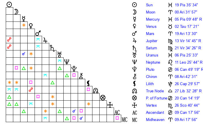 | Saturn | 22 Virgo 20 | 21 Pisces 48 | 19 Virgo 33 |