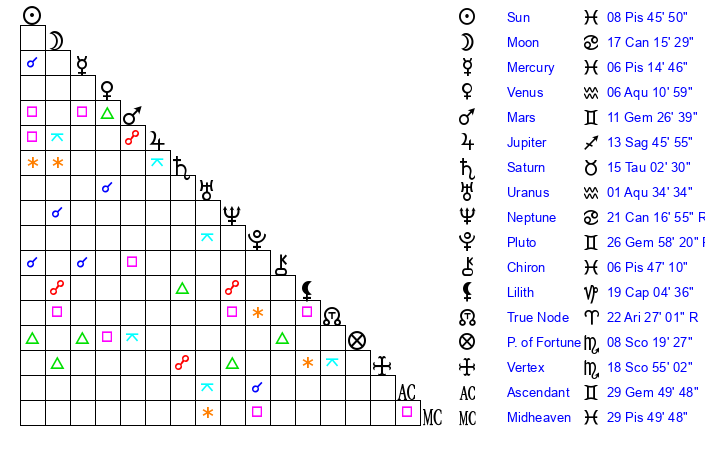 | Sun | 8 Pisces 45 | 10 Pisces 21 | 28 Gemini 57 |