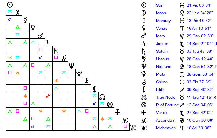 | Neptune | 18 Cancer 51 | 29 Pisces 19 | 20 Cancer 54 |
