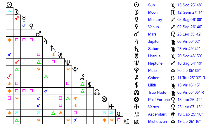 | Sun | 13 Scorpio 26 | 14 Scorpio 31 | 28 Sagittarius 58 |