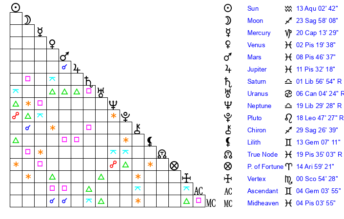 | Neptune | 19 Libra 29 | 28 Pisces 1 | 17 Libra 55 |