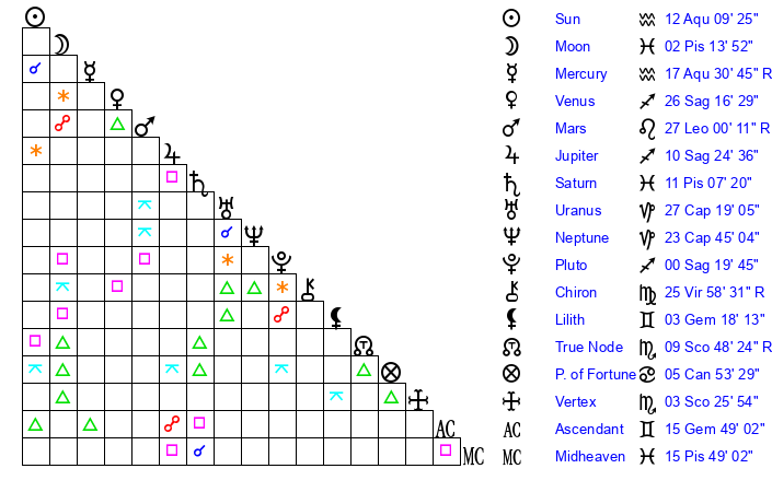Sun | 12 Aquarius 9 | 12 Aquarius 53 | 12 Pisces 26 |