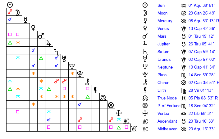 | Venus | 13 Capricorn 43 | 18 Pisces 34 | 28 Aquarius 45 |