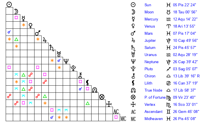 | Sun | 5 Pisces 22 | 6 Pisces 20 | 4 Aries 20 |