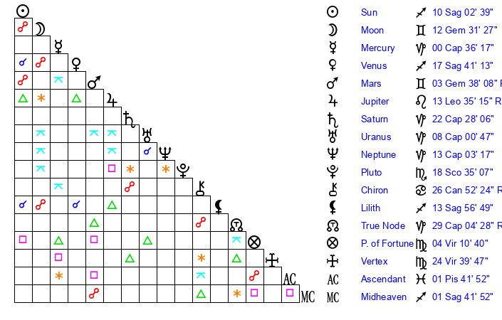 Sun | 10 Sagittarius 2 | 10 Sagittarius 48 | 14 Capricorn 38 |