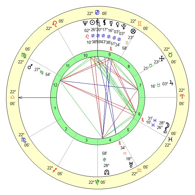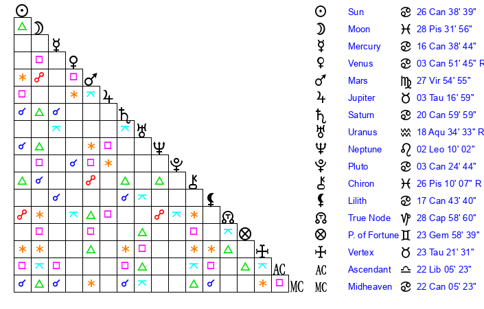 | Sun | 26 Cancer 38 | 27 Cancer 16 | 12 Scorpio 57 |