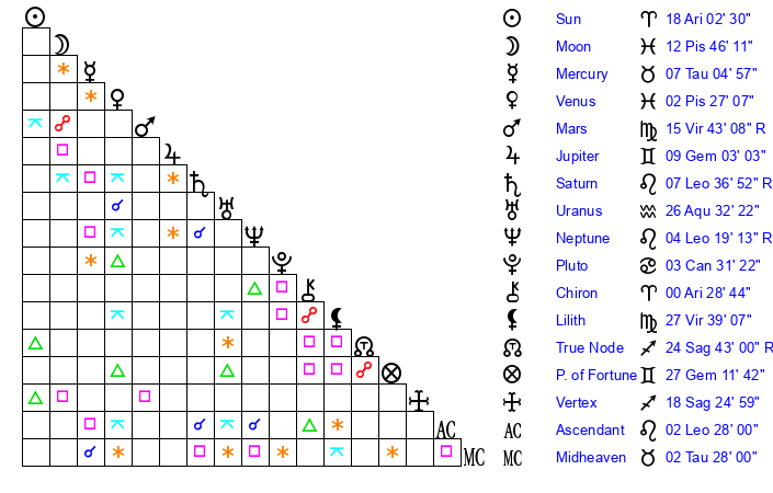 | Moon | 12 Pisces 54 | 1 Virgo 40 | 12 Aquarius 14 |