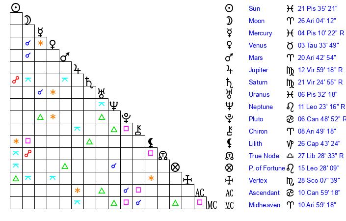 | Moon | 26 Aries 10 | 4 Virgo 33 | 20 Aquarius 3 |