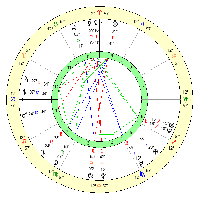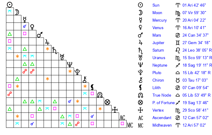 | Sun | 1 Aries 43 | 2 Aries 19 | 17 Taurus 44 |