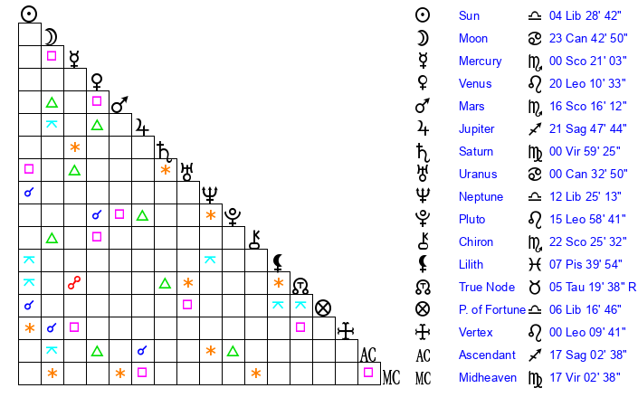 | Sun | 4 Libra 29 | 4 Libra 50 | 21 Sagittarius 37 |