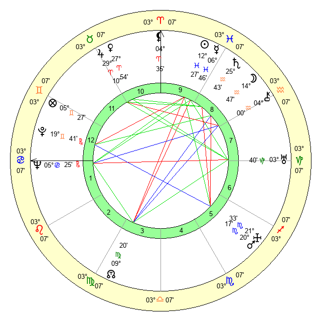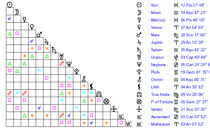 | Sun | 12 Pisces 28 | 13 Pisces 22 | 9 Cancer 9 |