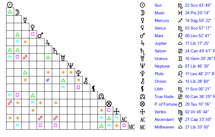 | Neptune | 7 Libra 47 | 29 Pisces 32 | 8 Libra 27 |