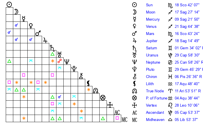 Jupiter | 18 Sagittarius 2 | 19 Gemini 32 | 11 Capricorn 53 |