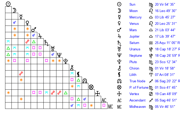 | Moon | 16 Leo 46 | 11 Gemini 23 | 25 Libra 27 |