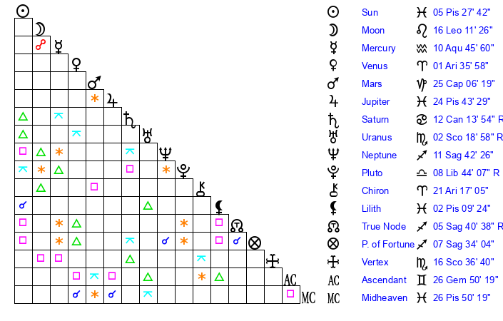 Saturn | 12 Cancer 36 | 20 Pisces 6 | 13 Cancer 14 |