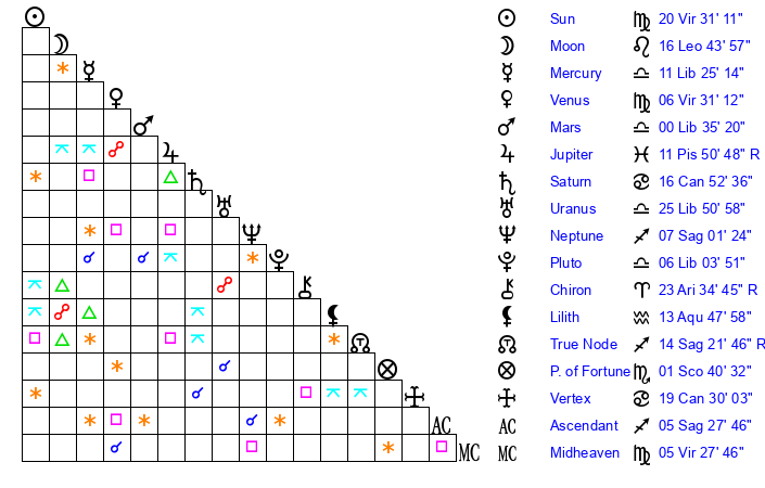 | Venus | 6 Virgo 31 | 22 Leo 55 | 10 Scorpio 11 |
