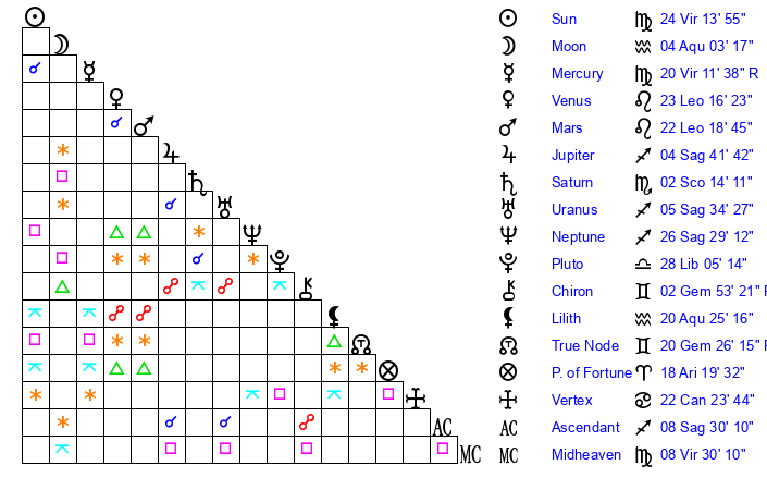 | Sun | 24 Virgo 14 | 25 Virgo 3 | 5 Scorpio 42 |