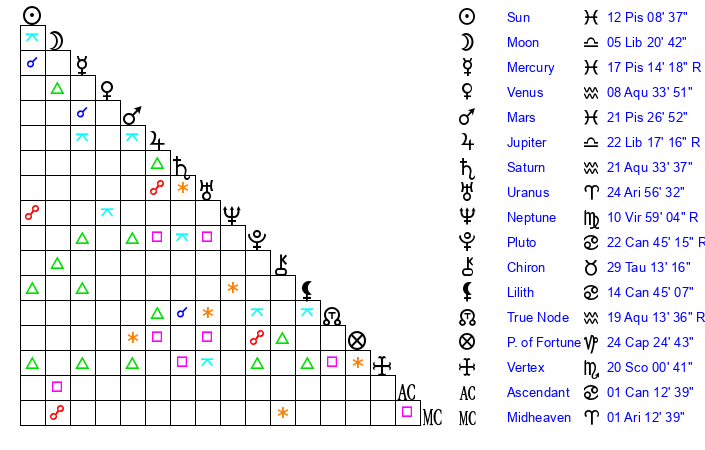 Moon | 5 Libra 24 | 29 Aries 32 | 13 Aquarius 17 |
