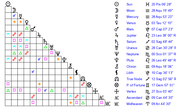 | Sun | 20 Pisces 6 | 20 Pisces 22 | 27 Taurus 42 |