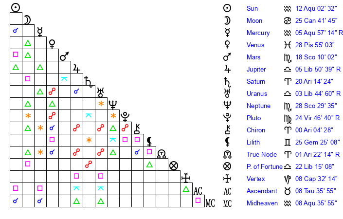 | Moon | 25 Cancer 42 | 16 Pisces 2 | 11 Leo 46 |