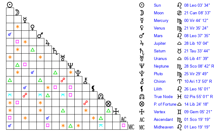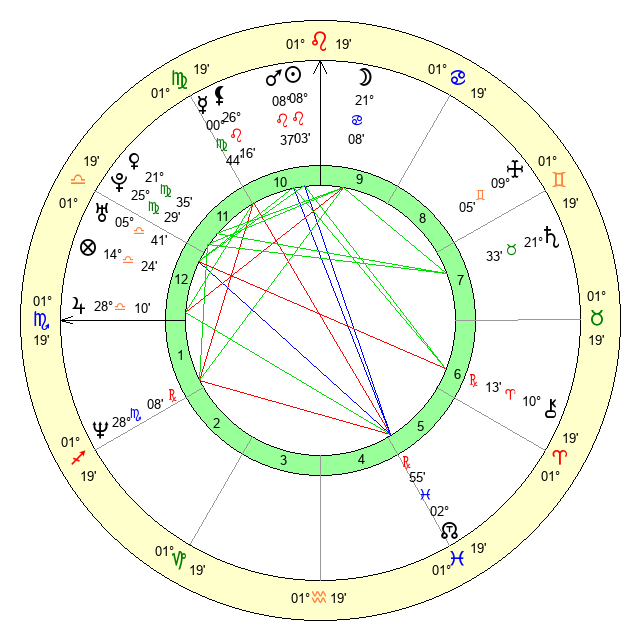 Venus | 21 Virgo 35 | 0 Cancer 38 | 14 Scorpio 35 |