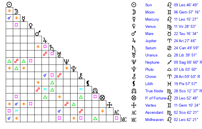 | Neptune | 9 Sagittarius 6 | 1 Aries 57 | 9 Sagittarius 16 |