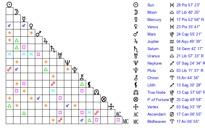 Saturn | 15 Gemini 0 | 22 Pisces 55 | 19 Gemini 53 |