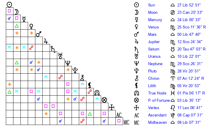 Sun | 27 Libra 53 | 28 Libra 47 | 22 Sagittarius 18 |