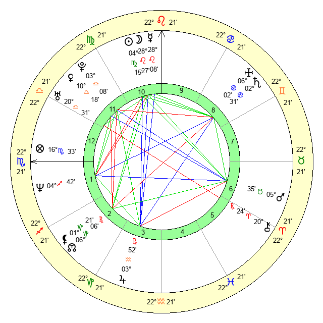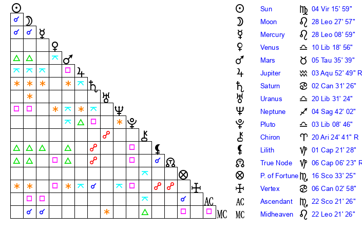 Moon | 28 Leo 26 | 25 Libra 50 | 21 Cancer 58 |