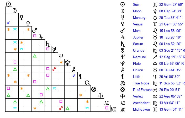 | Sun | 22 Gemini 28 | 22 Gemini 37 | 9 Leo 13 |