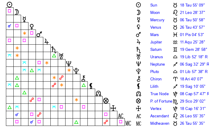 | Sun | 18 Taurus 55 | 19 Taurus 19 | 8 Cancer 44 |