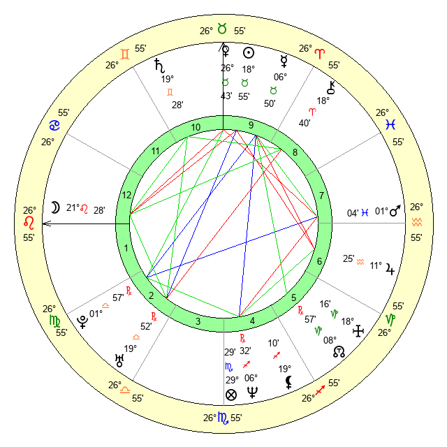 | Moon | 21 Leo 33 | 16 Libra 39 | 11 Cancer 53 |