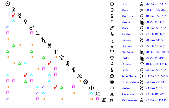 Sun | 26 Cancer 36 | 27 Cancer 16 | 19 Virgo 30 |