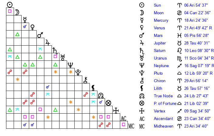 | Moon | 4 Cancer 12 | 12 Pisces 58 | 16 Aries 21 |