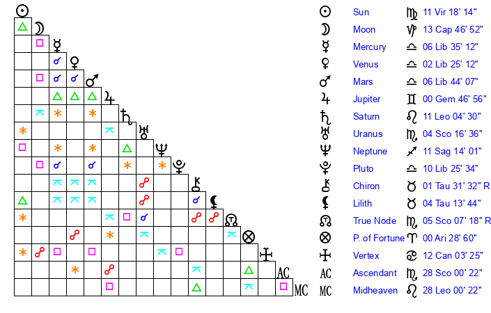 | Saturn | 11 Leo 25 | 29 Pisces 42 | 16 Leo 3 |