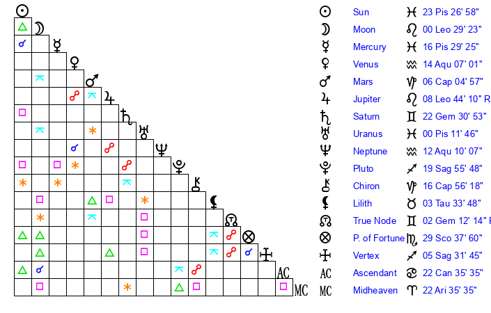 Venus | 14 Aquarius 7 | 7 Aries 41 | 10 Pisces 27 |