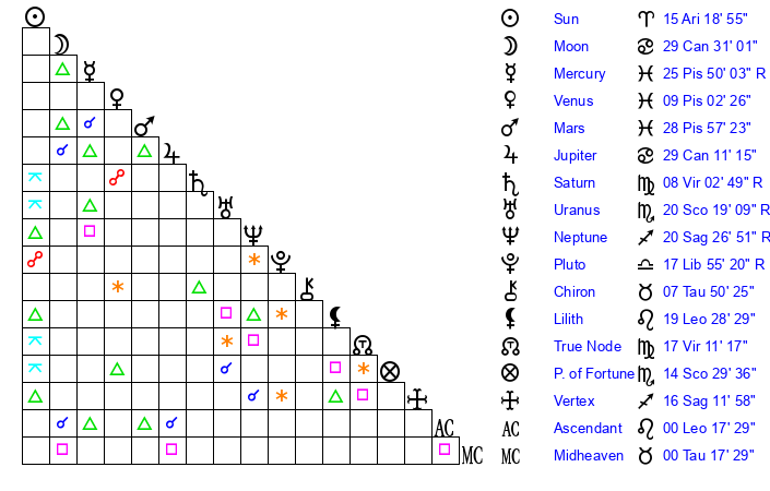 | Moon | 29 Cancer 32 | 23 Cancer 47 | 5 Aries 30 |