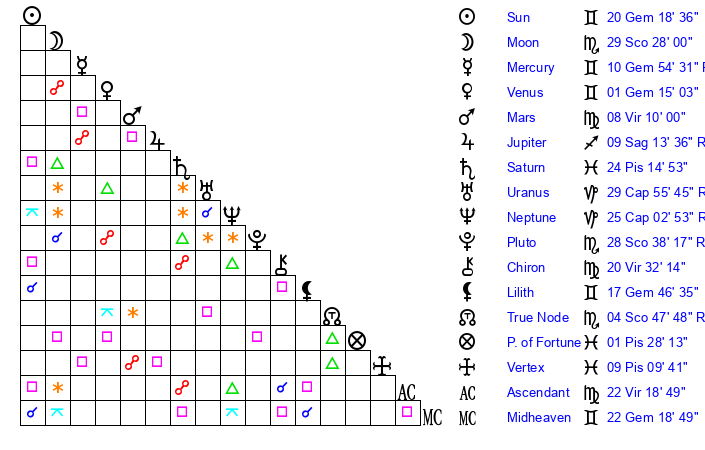 Sun | 20 Gemini 18 | 21 Gemini 1 | 18 Cancer 55 |