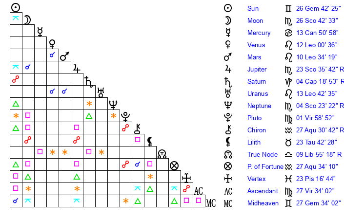 | Sun | 26 Gemini 42 | 27 Gemini 42 | 29 Leo 48 |