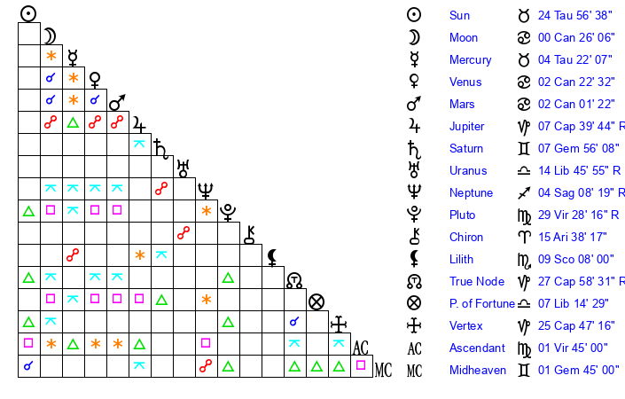 Venus | 2 Cancer 22 | 10 Aries 24 | 18 Gemini 15 |