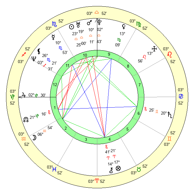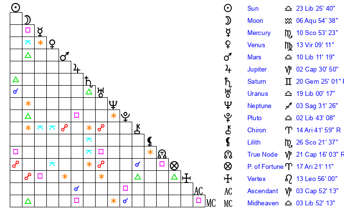 Pluto | 2 Libra 42 | 1 Aquarius 21 | 4 Libra 11 |