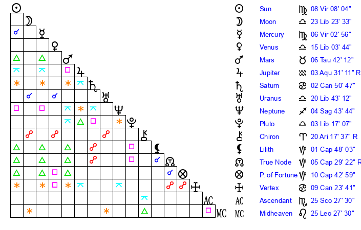 Moon | 23 Libra 31 | 13 Sagittarius 23 | 17 Virgo 19 |